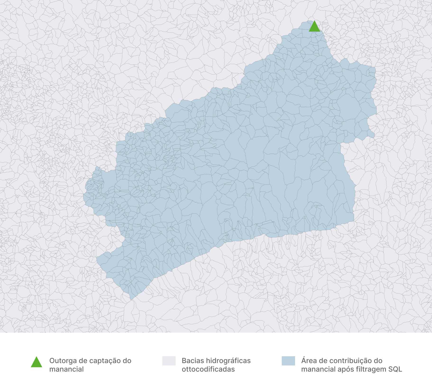 A etapa inicial do Sistema de Segurança Hídrica foi delimitar o recorte geográfico do fenômeno avaliado, ou seja, a definição dos limites externos da área de contribuição de cada manancial de abastecimento público de Minas Gerais. Para tanto, foram utilizadas as camadas de informação geográfica referentes às ottobacias e às outorgas superficiais disponíveis na IDE-Sisema. O resultado dessa etapa culminou na delimitação de todas as áreas de contribuição dos mananciais de abastecimento público em Minas Gerais.