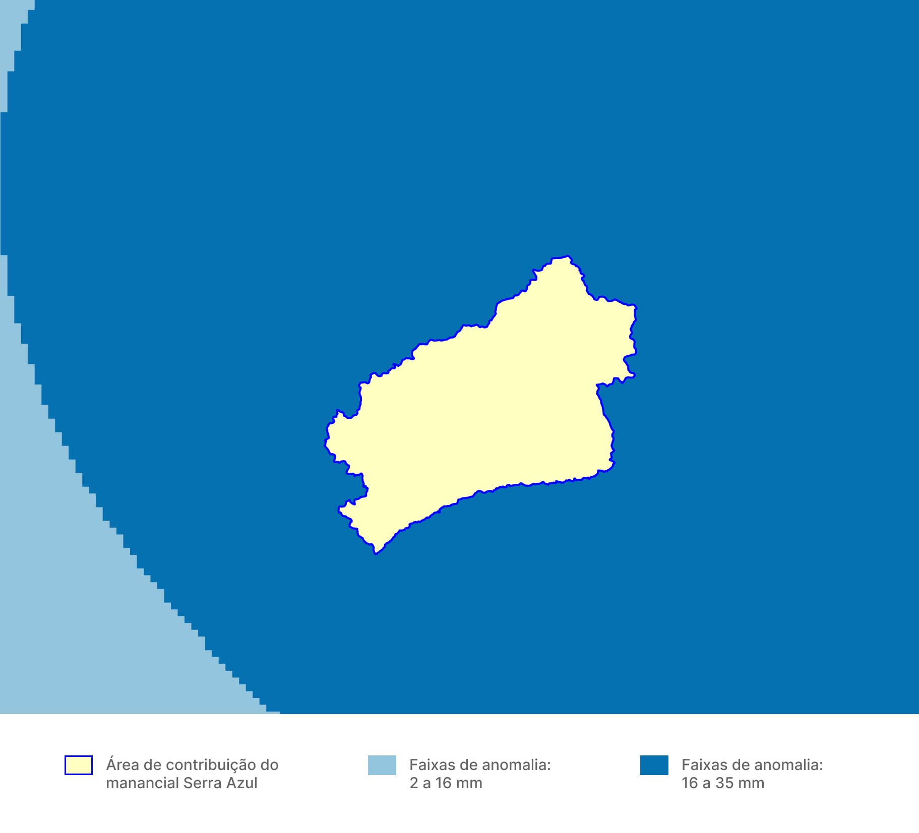 Vale destacar que a escala cartográfica da camada de anomalia pluviométrica é generalista e, por essa razão, pode-se incorrer em situações em que um determinado manancial esteja totalmente inserido em isolinhas de valores semelhantes.
